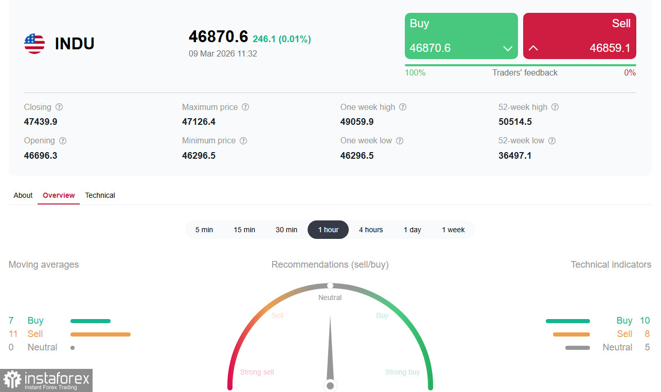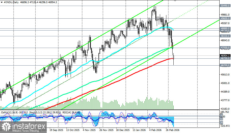 Долгосрочный и глобальный тренд индекса DJIA остается бычьим. Однако пробой зоны поддержки 46250.0-46000.0 открывает дорогу к дальнейшему падению (подробнее см. в DJIA (INDU): сценарии динамики на 09.03.2026).