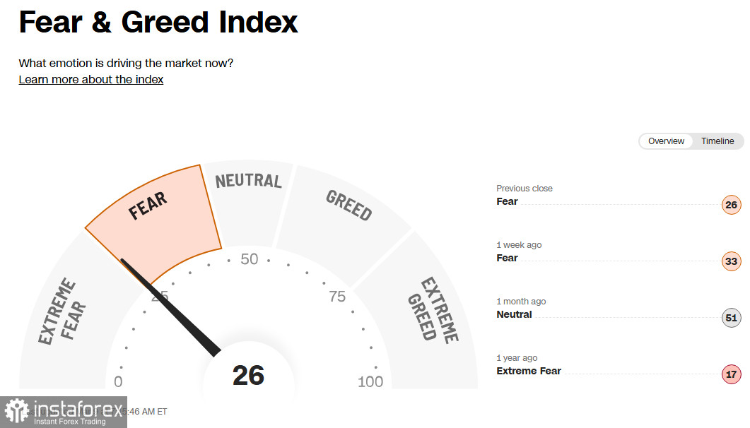 Так называемый индекс «страха и жадности» инвесторов остается в зоне «страха» и на отметке 26 (из 100), практически, на границе с зоной «экстремального страха».