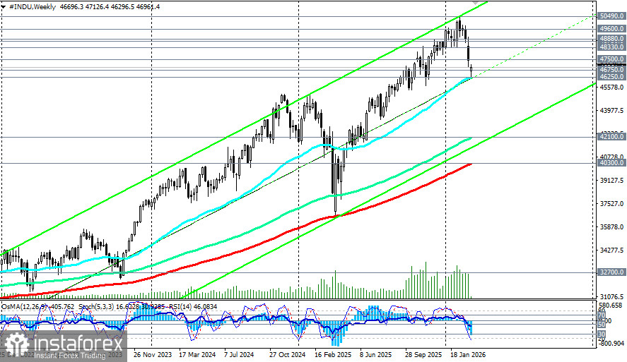 Сегодня цена на фьючерсы DJIA (INDU в торговом терминале) протестировала ключевую поддержку 46750.0 (ЕМА200 на дневном графике), отделяющую среднесрочный бычий рынок от медвежьего, и вплотную приблизилась к важному среднесрочному уровню поддержки 46250.0 (ЕМА50 на недельном графике).