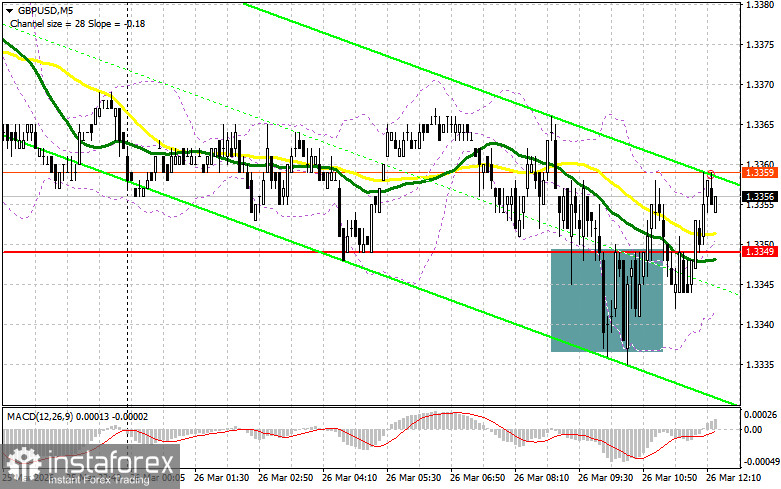 В своем утреннем прогнозе я обращал внимание на уровень 1.3349 и планировал от него принимать решения по входу в рынок. Давайте посмотрим на 5-минутный график и разберемся с тем, что там произошло. Снижение и формирование ложного пробоя в районе 1.3349 привели к точке входа на покупку фунта, что вылилось в небольшое движение пары вверх лишь на 10 пунктов. На вторую половине дня техническая картина была пересмотрена.