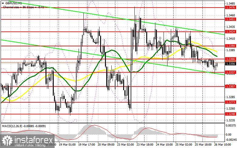 Отсутствие важной статистики по Великобритании привело к обновлению недельного минимума, но на этом все закончилось. Более активных продаж фунта я так и не дождался. Это указывает на отсутствие ориентиров. Во второй половине дня следует уделить внимание недельному числу первичных обращений за пособием по безработице в США, а также выступлению члена FOMC Лизы Д. Кук. Но куда более интересно, как будет развиваться ситуация на Ближнем Востоке. Плохие новости наверняка вернут давление на GBP/USD. В таком случае первого проявления покупателей буду ждать в районе новой поддержки 1.3337. Формирование там ложного пробоя даст точку входа в длинные позиции в расчете восстановление к уровню 1.3366, образованному по итогам европейской сессии. Прорыв с обратным тестом сверху вниз этого диапазона приведут уже к новой точке входа в длинные позиции с перспективой выхода на 1.3394. Самой дальней целью окажется область 1.3424, где собираюсь фиксировать прибыль. При сценарии снижения GBP/USD и отсутствия активности со стороны быков на уровне 1.3337, давление на пару ощутимо возрастет, что приведет к падению в район минимума 1.3307. В таком случае лишь формирование там ложного пробоя будет подходящим условием на открытие длинных позиций. Покупать GBP/USD сразу на отскок собираюсь от поддержки 1.3273 с целью коррекции в 30-35 пунктов внутри дня.