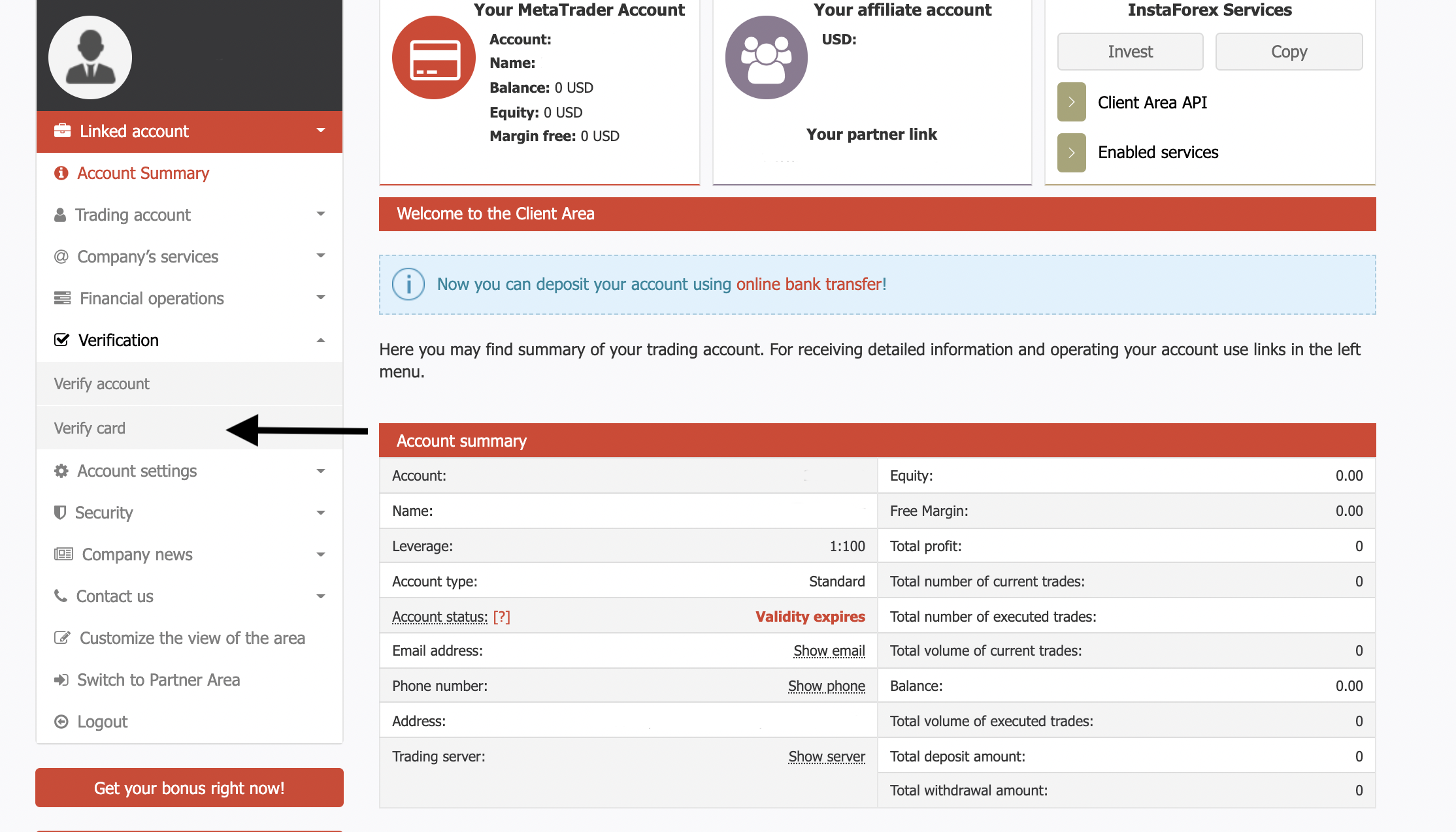 Để tải lên ảnh thẻ ngân hàng của bạn, vui lòng đăng nhập vào Khu vực khách hàng của bạn, chọn Xác minh trong menu bên trái, sau đó nhấp vào Xác minh thẻ. Trên trang web này, bạn có thể tải lên ảnh mặt trước và mặt sau của thẻ ngân hàng của mình. Xin đừng quên ẩn dữ liệu nhạy cảm trên hình ảnh.