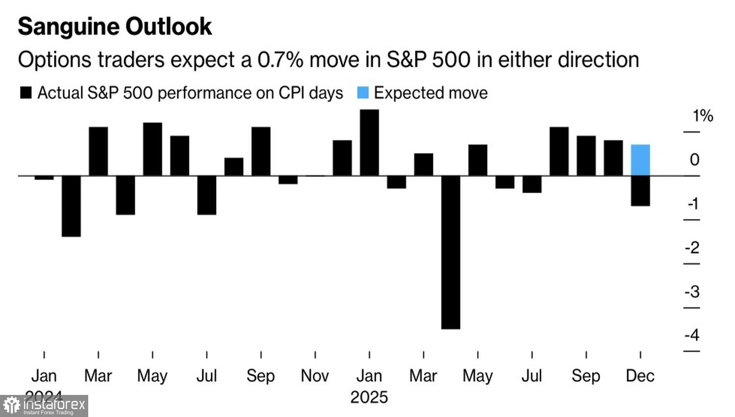 Тем не менее, профессионалы не ждут от широкого фондового индекса бурной реакции на публикацию статистики по ноябрьской инфляции. Прогнозируется, что S&P 500 будет колебаться не более чем на 0,7% в ту или иную сторону. Историческое среднее реакции показателя на важные данные составляет +/-1%. Низкая чувствительность обусловлена сигналами ФРС, что для нее занятость важнее потребительских цен.