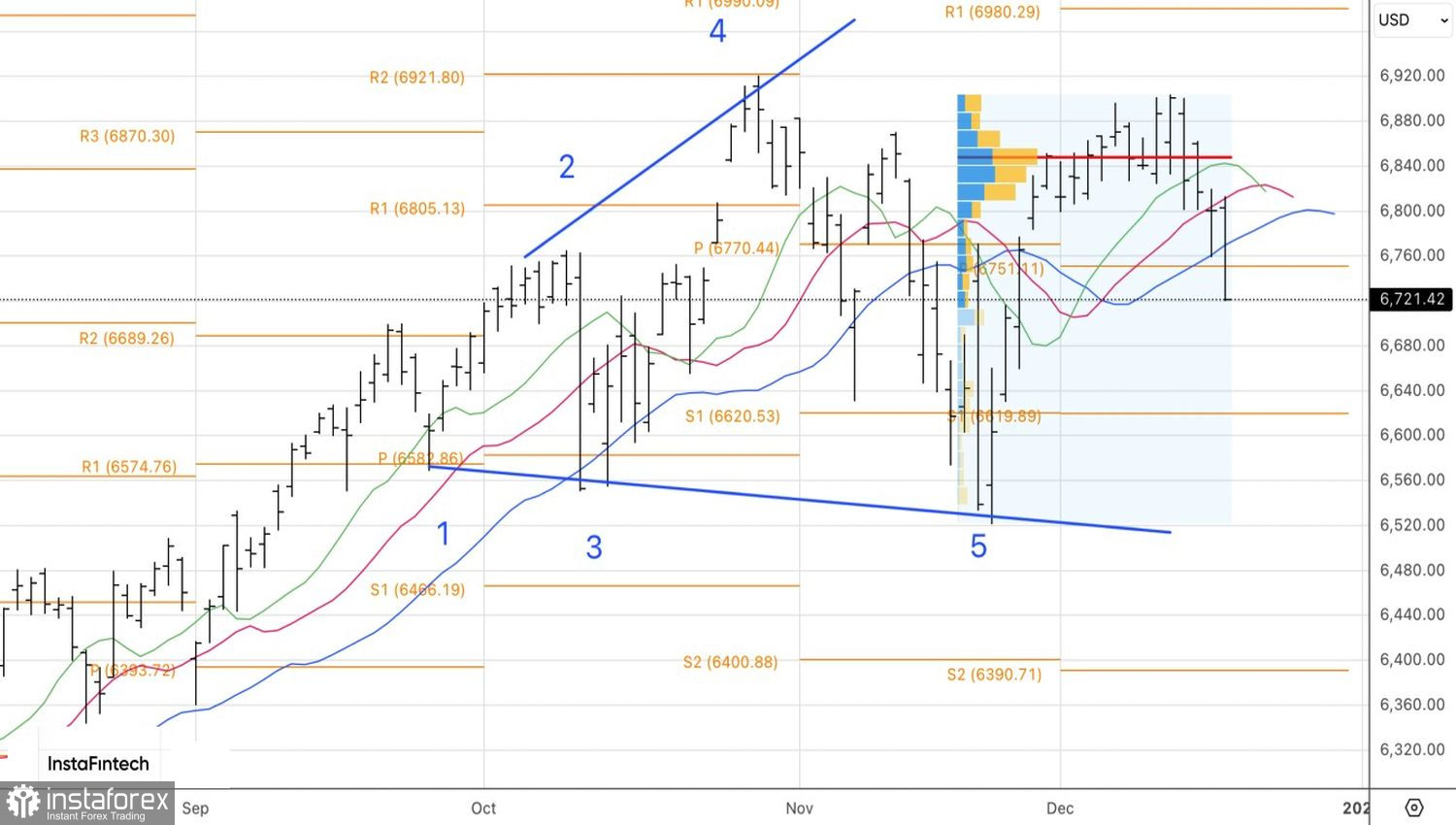 Технически на дневном графике S&P 500 имеет место прорыв всех трех динамических поддержек в виде скользящих средних. Это свидетельствует о серьезности намерений продавцов. Пока широкий фондовый индекс торгуется ниже пивот-уровня 6750, настроение остается «медвежьим», имеет смысл сделать акцент на короткие позиции. Впрочем, отбой от зоны конвергенции 6690-6700 может перевернуть все с ног на голову.
